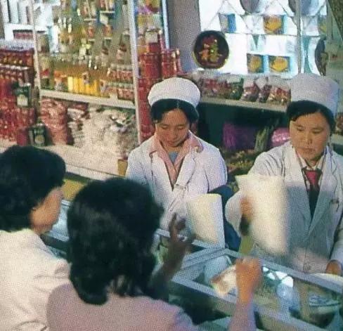 這應(yīng)該是皇姑副食商場(chǎng)的醬菜柜臺(tái),每個(gè)柜臺(tái)都是隔著玻璃封閉的。營(yíng)業(yè)員與顧客交易要通過(guò)售貨窗口。