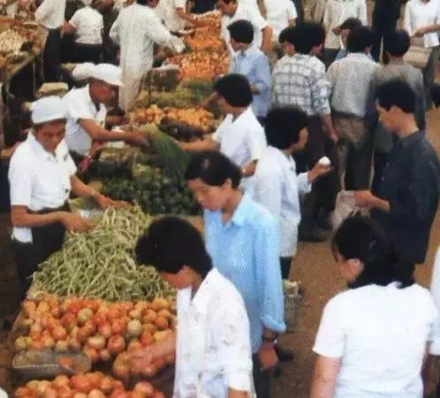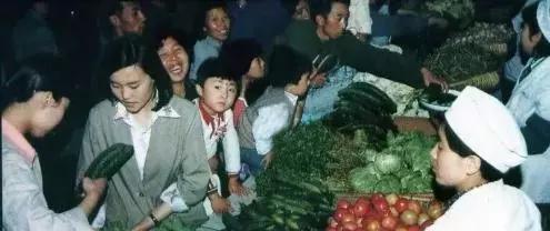 這張照片像是在秋季拍攝,也有擺拍“嫌疑”。因?yàn)樵谀莻€(gè)年代平時(shí)副食品商場(chǎng)的蔬菜柜臺(tái)品種絕沒(méi)有這么豐滿齊全。照片上的很多顧客對(duì)拍攝者都投來(lái)了關(guān)注的目光。