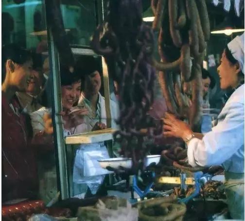這是皇姑副食品商場(chǎng)的熟食柜臺(tái),與前面的醬菜柜臺(tái)一樣,這里與顧客也是用玻璃隔斷分開(kāi)的。看到柜臺(tái)內(nèi)擺放的各種熟肉和香腸,感覺(jué)這張照片應(yīng)該是事前又準(zhǔn)備的擺拍。因?yàn)槟菚r(shí)副食商場(chǎng)熟食柜臺(tái)上很難看到如此豐滿的情景。