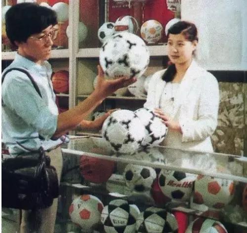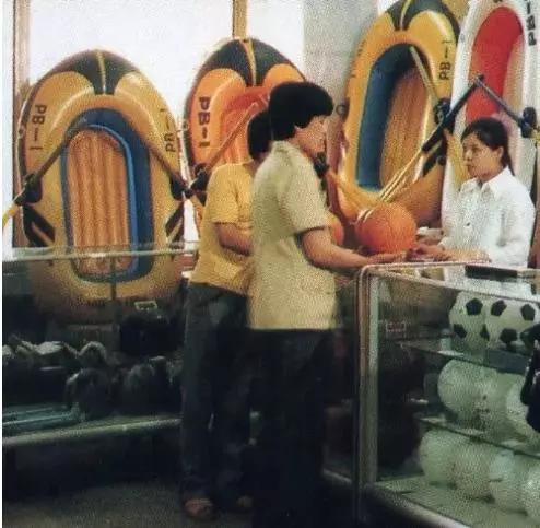 賣球類的柜臺(tái)前,那時(shí)候商品總是用柜臺(tái)與顧客隔開(kāi)。